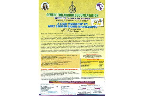 tout d’abord à Bologne, en septembre 2002, à la Conférence internationale sur les manuscrits du Coran, organisée par François Déroche (), puis à Londres, en octobre 2003, au colloque organisé par Fahmida Suleman, « Word of God. Art of Man ». Le Dr. Jimoh, parlant des manuscrits du Nigéria, y a tenu une ligne de lecture résolument anthropologique.Le Dr. Jimoh a décidé d’organiser un colloque sur le manuscrit pour fêter les 50 ans de l’Institute of African Studies de l’Université d’Ibadan, dans le cadre du Centre auquel il appartient, le Centre for Arabic Documentation (Programme, cliché 1). L’événement a reçu le soutien de l’IFRA (cliché 3). Seyni Moumouni, Enseignant chercheur à l’Institut de Recherche en Sciences Humaines de l’Université Abdou Moumouni de Niamey (Niger, cliché 16) et moi-même avons pu nous y rendre grâce à l’IFRA. J’ai pris l’avion, tandis que Seyni, reprenant d’anciennes routes caravanières, traversait une partie du Sahel par la route, puis accomplissait un saut de puce en avion.